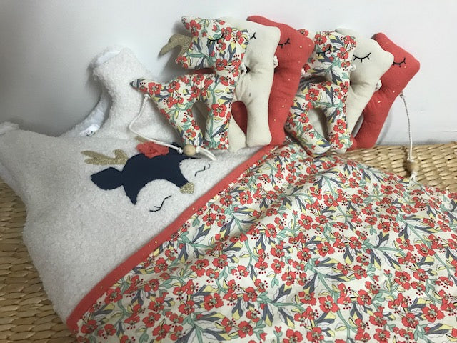 This small garland composed of 9 drops measures approximately 1m50. Two raw wooden beads frame each of the small drops. This garland will brighten up the baby's room. It is attached by means of loops provided at each end of it.