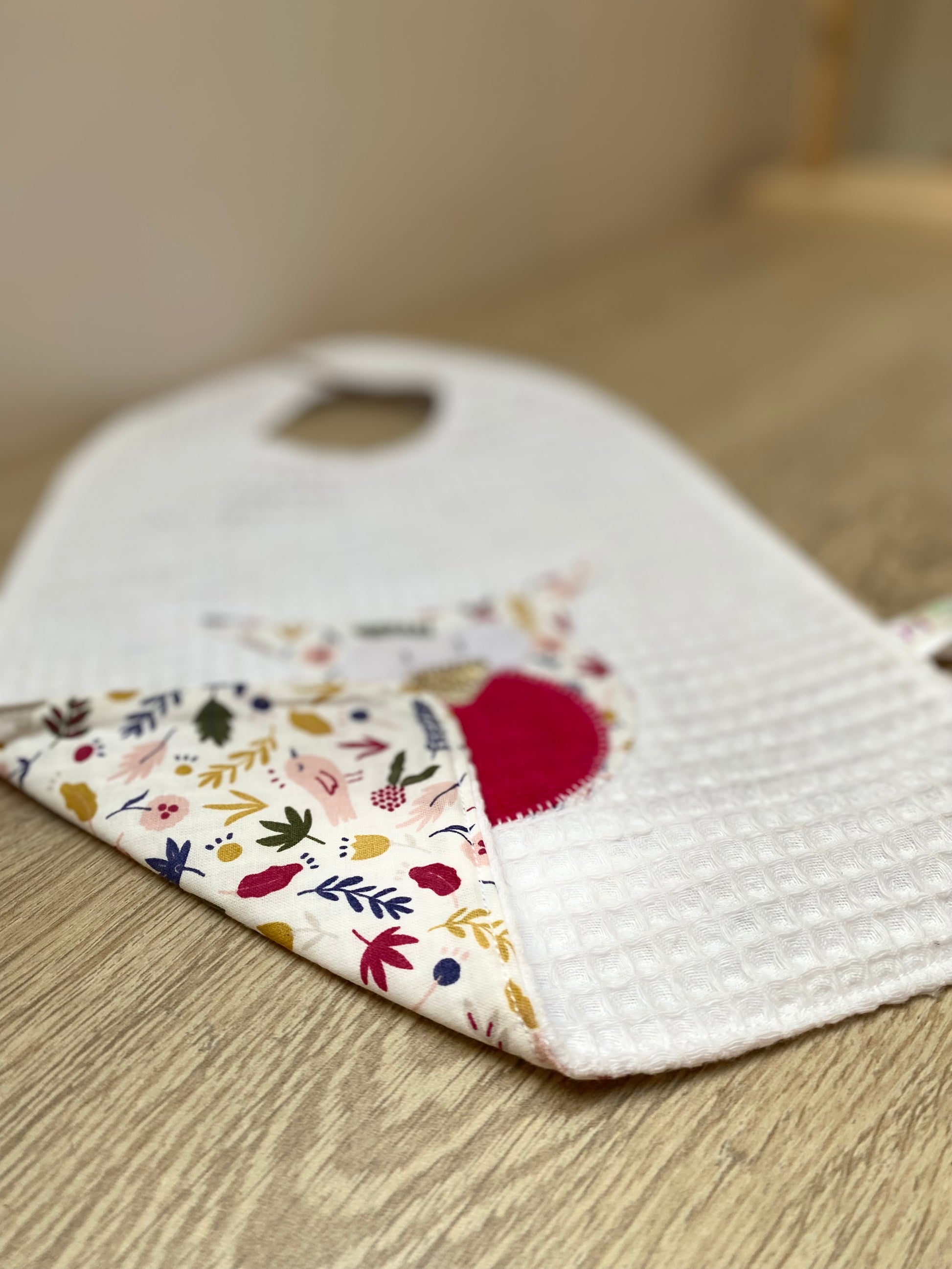 Ce bavoir mesure environ 40/25cm. Idéalement long, il protégera bébé lors de ses repas. C'est l'objet incontournable pour bébé.