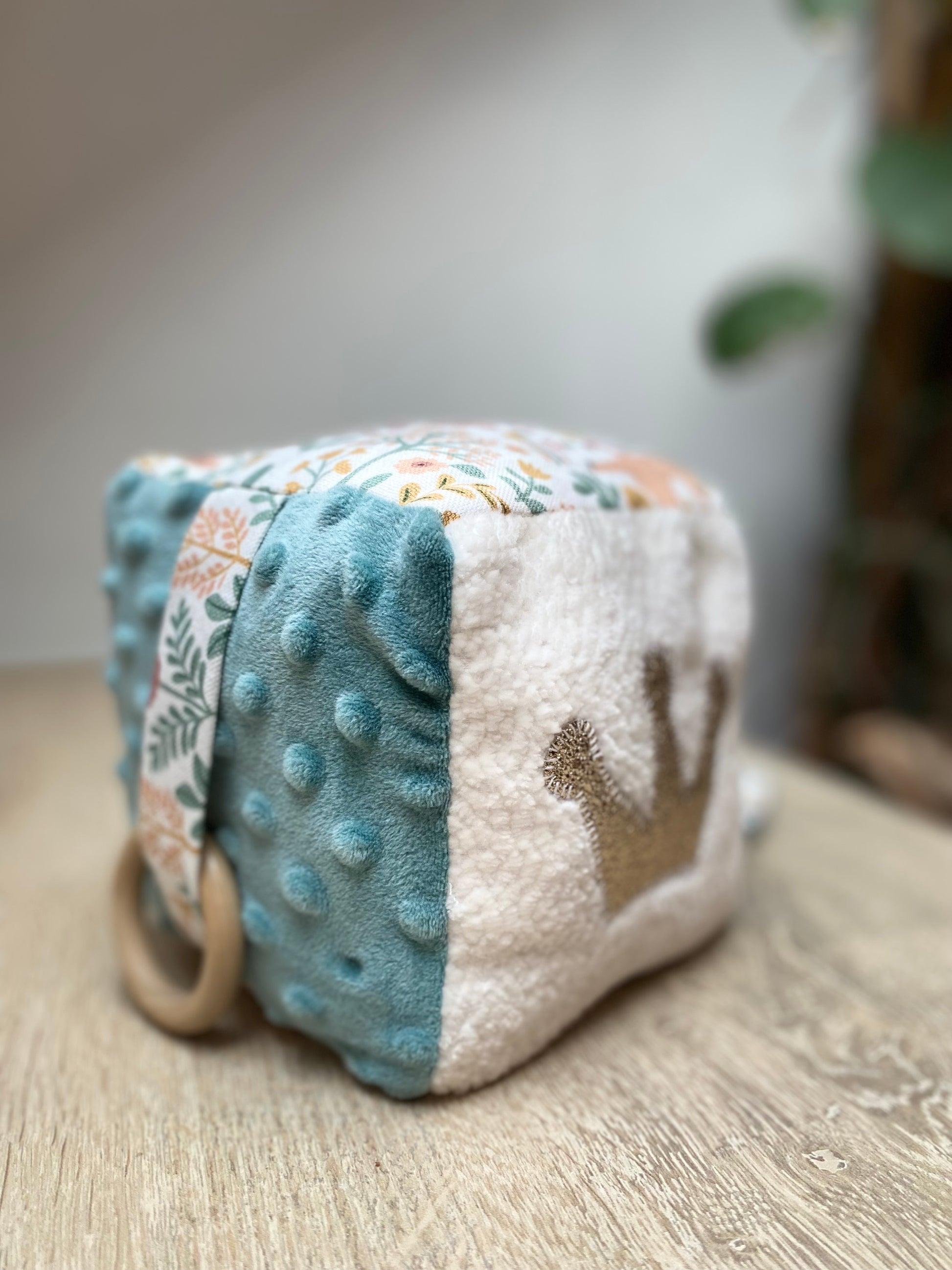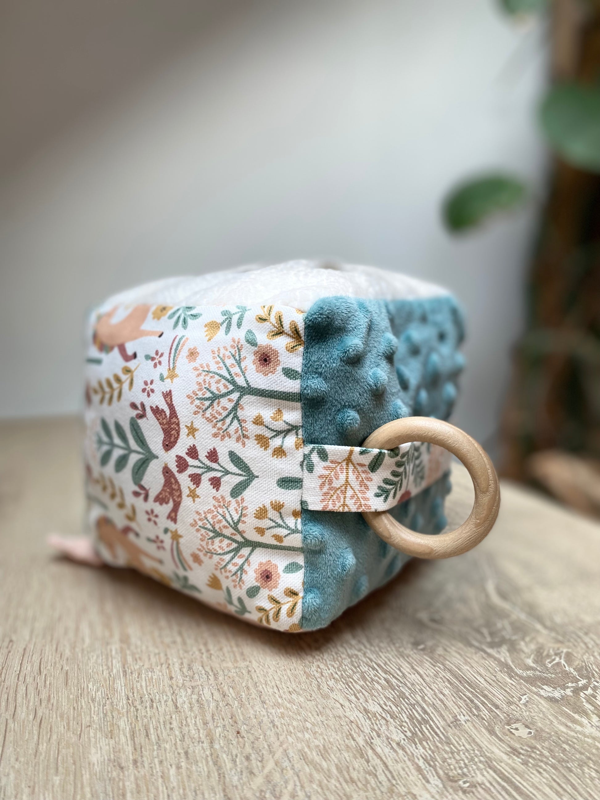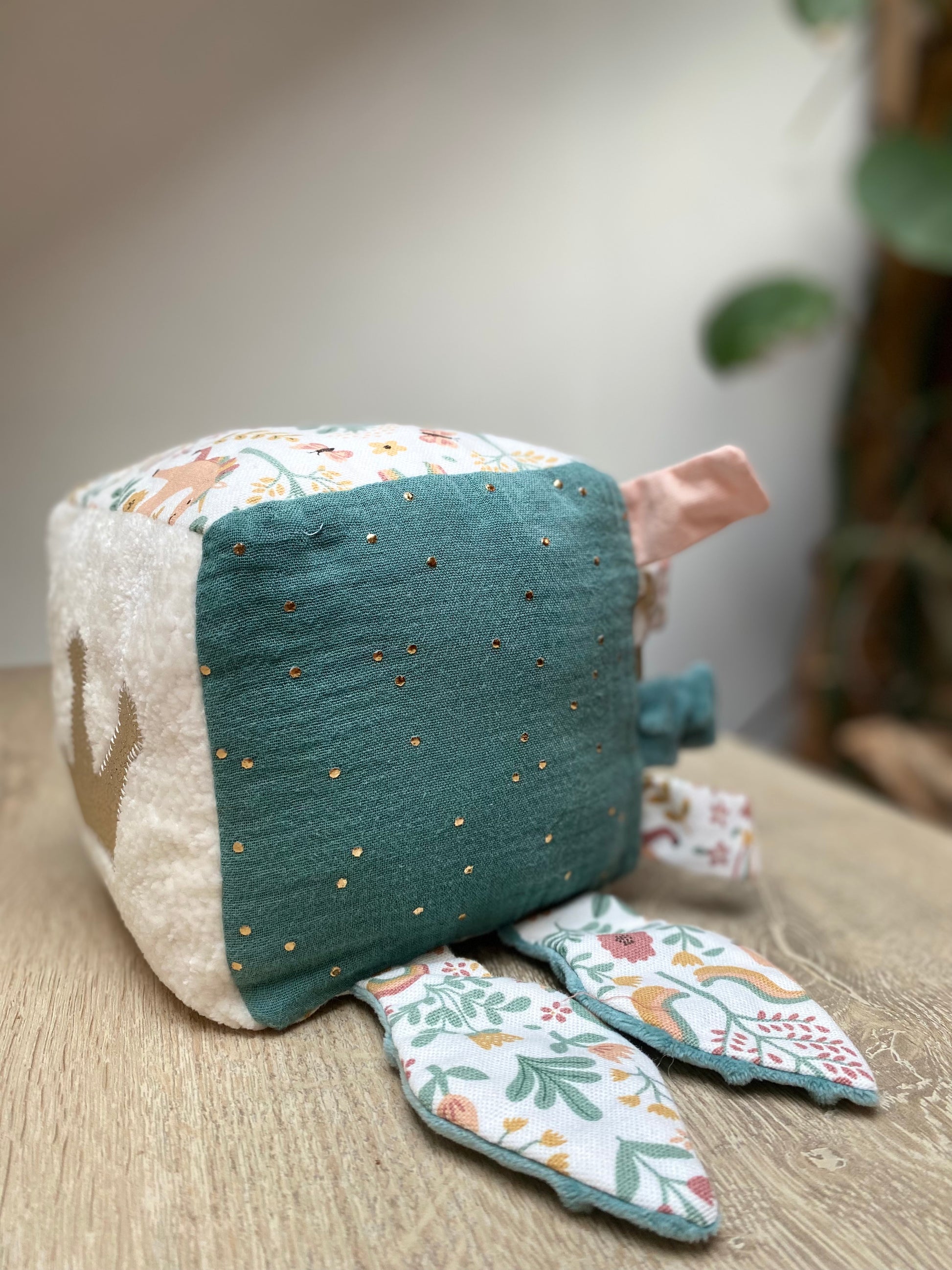 Ce cube éveil mesure 14/14/14cm. Il est agrémenté de petits accessoires pour que bébé puisse jouer et toucher différentes matières. Il est entièrement doublé pour éviter que la ouate ne sorte si la première couche est arrachée.