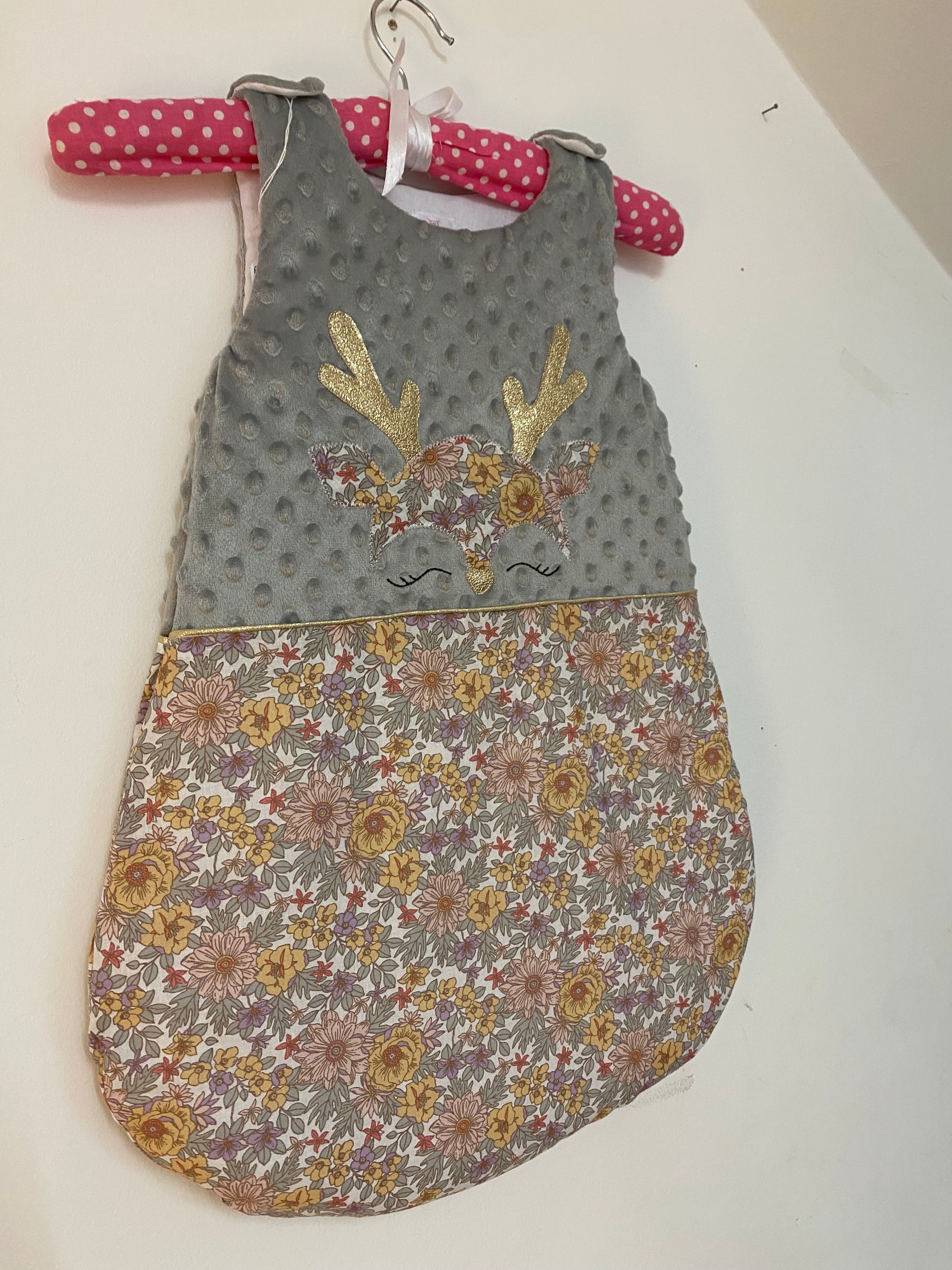 Elle est faiblement ouatée pour les nuits de mis saison et d'été. Elle s'ouvre sur le côté droit, au moyen d'une fermeture éclair. Elle fait parti de la collection "petit cerf" dans les tons vert sauge agrémenté d'une touche de parme.