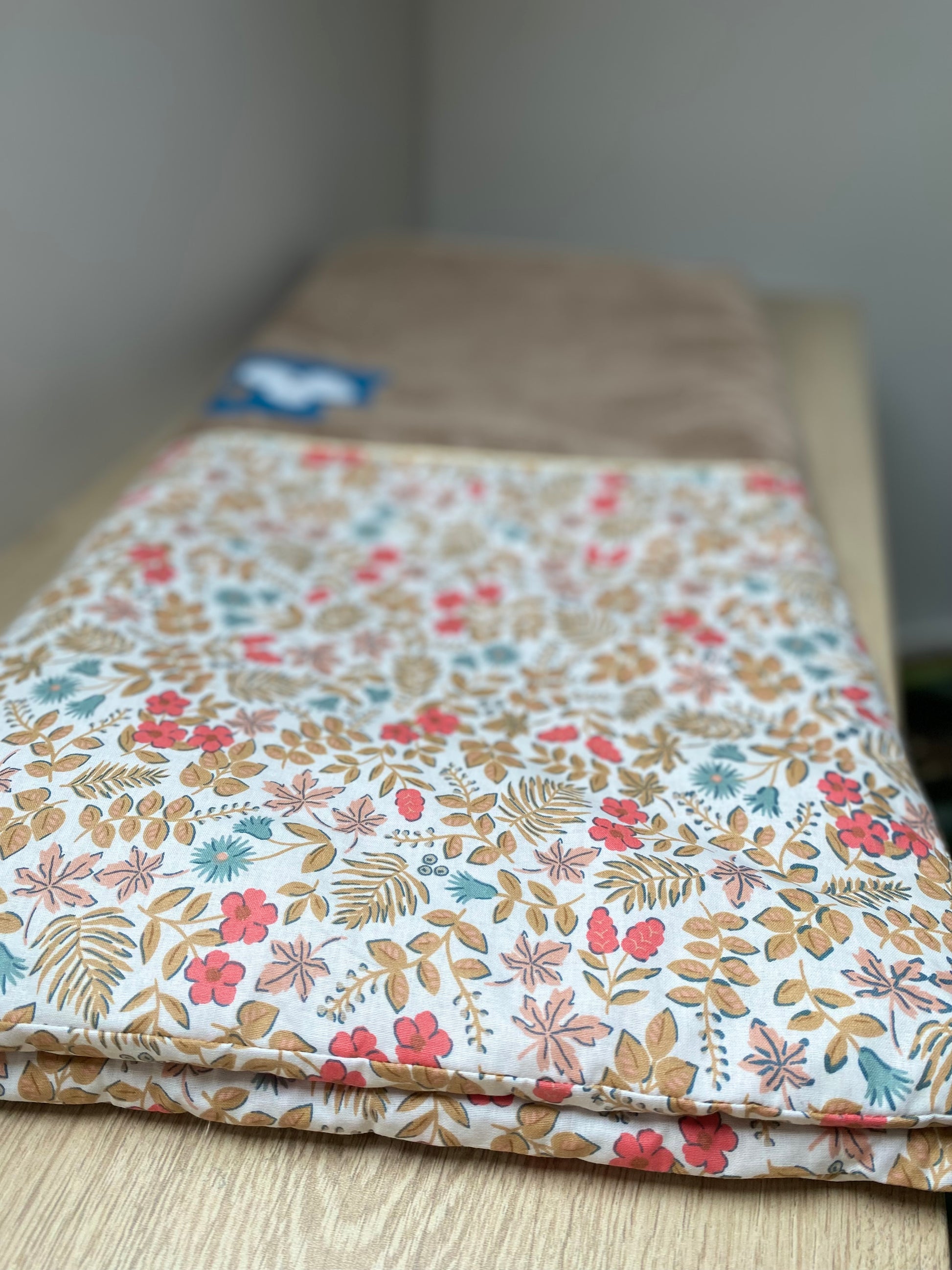 Ce plaid mesure environ 70/70cm. Il est entièrement ouaté. Vous pourrez l'utiliser pour les sorties en poussette lors des soirées fraîches.